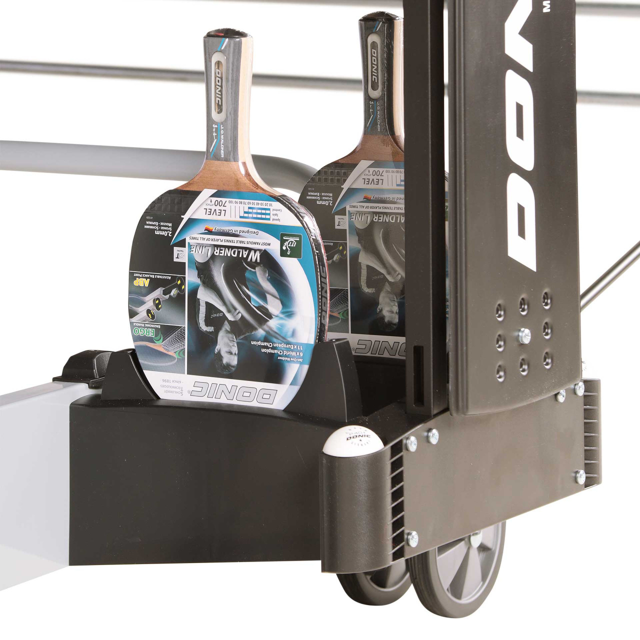 Mesa de interior robusta con tecnología compacta. Muy fácil de manejar gracias al sistema de bloqueo de seguridad. El tablero azul de 19 mm con estructura metálica de 36 mm alrededor garantiza un buen rebote de la pelota y estabilidad. Estructura inferior de tubo cuadrado de 25 x 25 mm. Las patas están reforzadas con 2 soportes metálicos. Incluye red y postes fijos, así como espacio para guardar raquetas y pelotas. Las ruedas de goma grandes de 128 mm proporcionan estabilidad y fácil manejo incluso en terrenos irregulares. Posición de juego libre: puedes jugar solo.